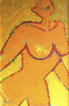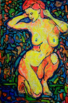 2016Vrouw naakt op knieen poserend; kleurrijk werk waarin ik alle kleurpartijen heb afgebakend dmv zwarte lijnen.