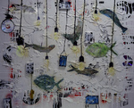 2014Fossielen vissen vermaken zich best tussen de cassette bandjes, cd schijfjes en ouderwetse gloeilampen