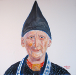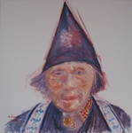 2004vlotte aquarel van Volendamse vrouw in Zondagse kledingi