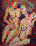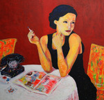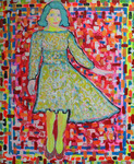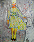 2013Vrouw blond haar op zolder met evenzo blonde hond. Merk lijkt op langharige hazewindhond of dergelijke. De oplettende bezoeker zal wellicht een ander schilderij in deze galerie ontdekken gelijkend op deze dame. Het schilderij is inderdaad aangepast. Nieuw kapsel, andere jurk. Achtergrond in zilver geschilderd en de hond wenste de aandacht van de vrouw. Aan u ter beoordeling of de aanpassingen misschien achterwege hadden moeten worden gelaten?
